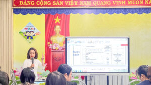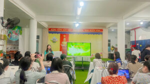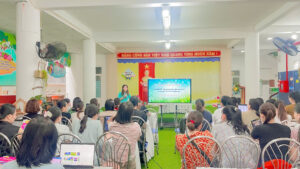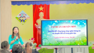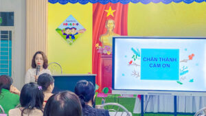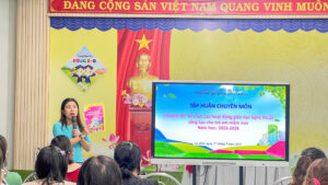 Thực hiện Kế hoạch số 45/KH-TMNHĐ ngày 24/9/2025 của trường mầm non Hồng Đào về việc tập huấn, bồi dưỡng nâng cao năng lực cho cán bộ quản lí và giáo viên mầm non đáp ứng yêu cầu đổi mới giáo dục năm học 2025-20256, ngày 27/9/2025 báo cáo viên đã tập huấn cho toàn thể giáo viên và chủ cơ sở GDMN độc lập trên địa bàn phường.